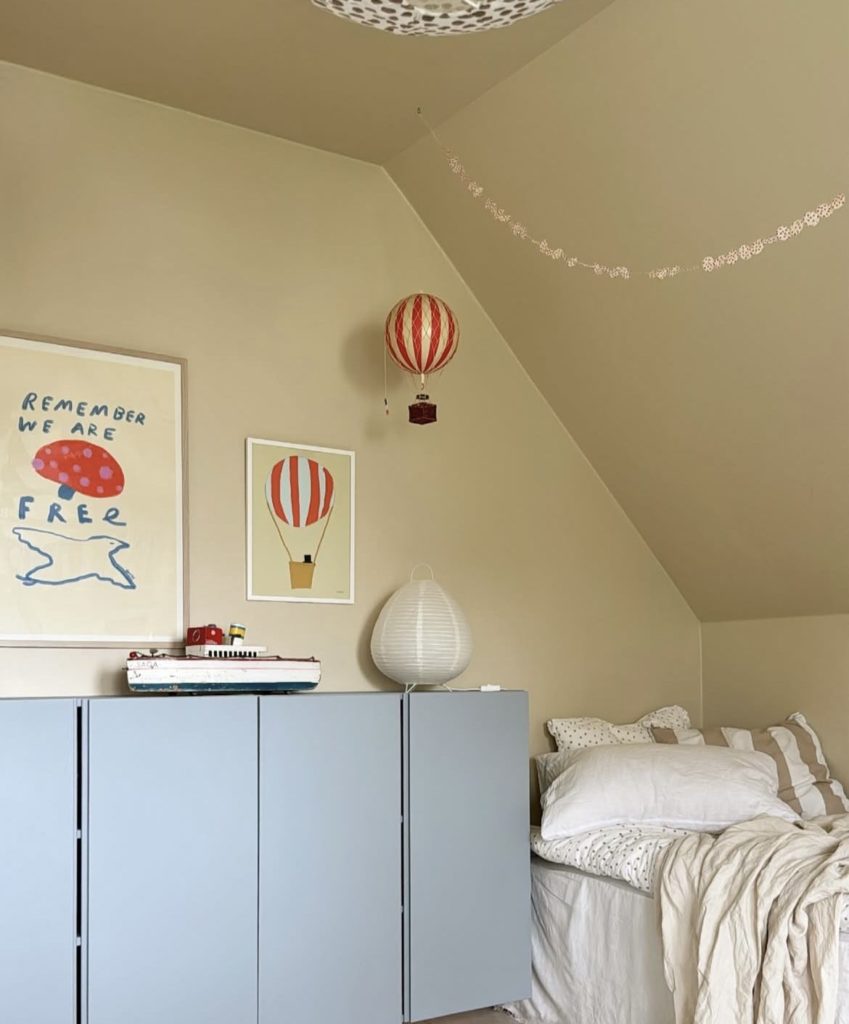 Want to give your IVAR sideboard more presence in a room? Try adding a low backsplash, or crédence, painted in the same hue or a complementary tone. This simple tweak creates a polished, custom-built look while visually anchoring the piece to the wall. Whether in a kids’ room or a hallway, it adds just enough architectural detail to frame your decor. Just Like in these exemples :
